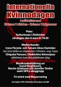I Sverige har Internationella kvinnodagen firats sedan 8 mars 1912. 2026 firas dagen på många platser i Sverige. SKV anordnar respektive deltar aktivt på följande platser: Olofström, Stockholm, Göteborg och Lund. – Kommentar till Stockholms affisch: Stockholms tjejjour och övriga 8-marskommittén anordnar en demonstration i Stockholm på Internationella kvinnodagen under parollen ”Internationellt systerskap – din…